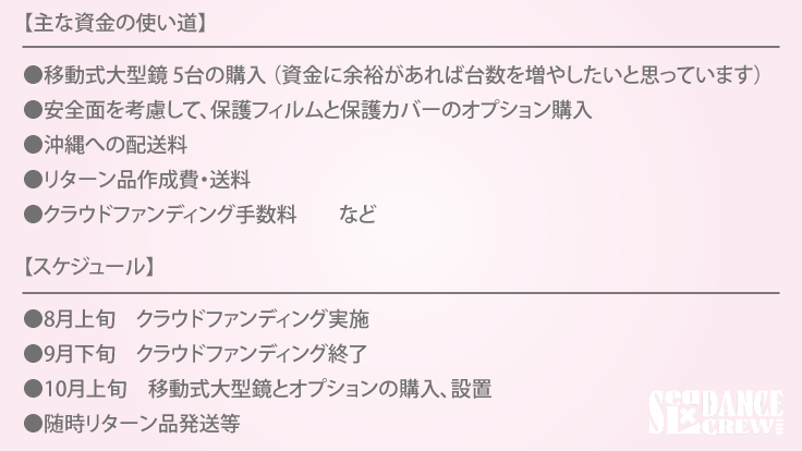 皆さまからご支援いただいた70万円は、移動式鏡の購入、その他諸費用に充てさせていただきます。 またもしご支援が多く集まった場合には、発表会の開催資金(場所代や運営費など)に充てさせていただく予定です。