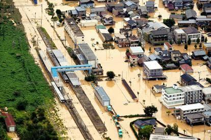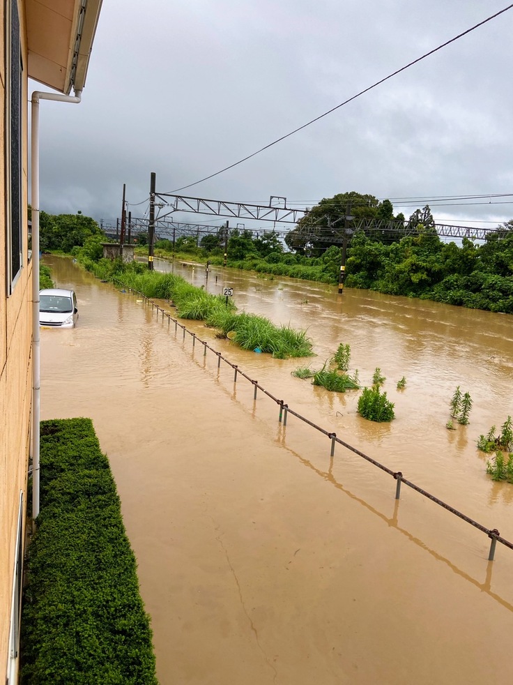 「朝早くにすみません。坂町駅前は浸水が凄くて、私は今お隣の美容室の方と一緒に、ビルの踊り場に避難しています。今は自転車やゴミ置き場がすっかり見えなくなる程の水位です。」