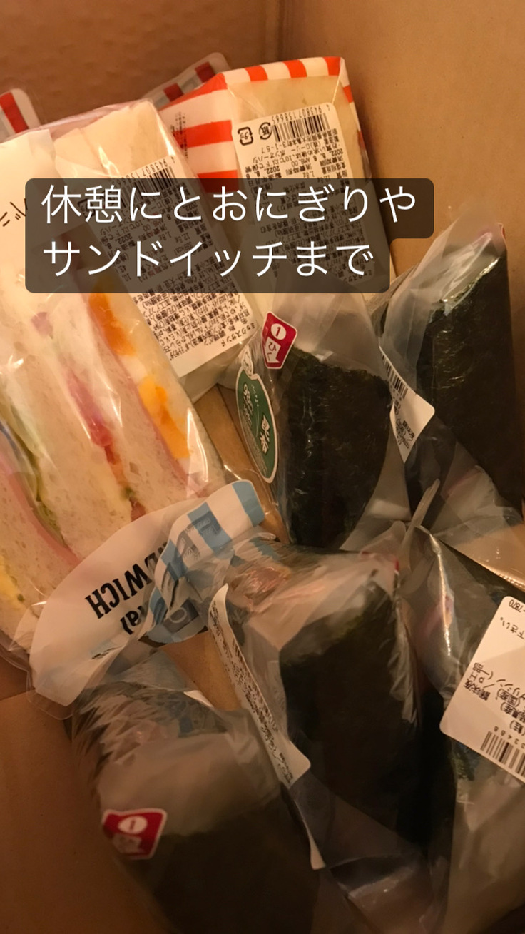 冷たい飲み水、スポーツドリンク、お茶、お菓子やおにぎりにサンドイッチ。