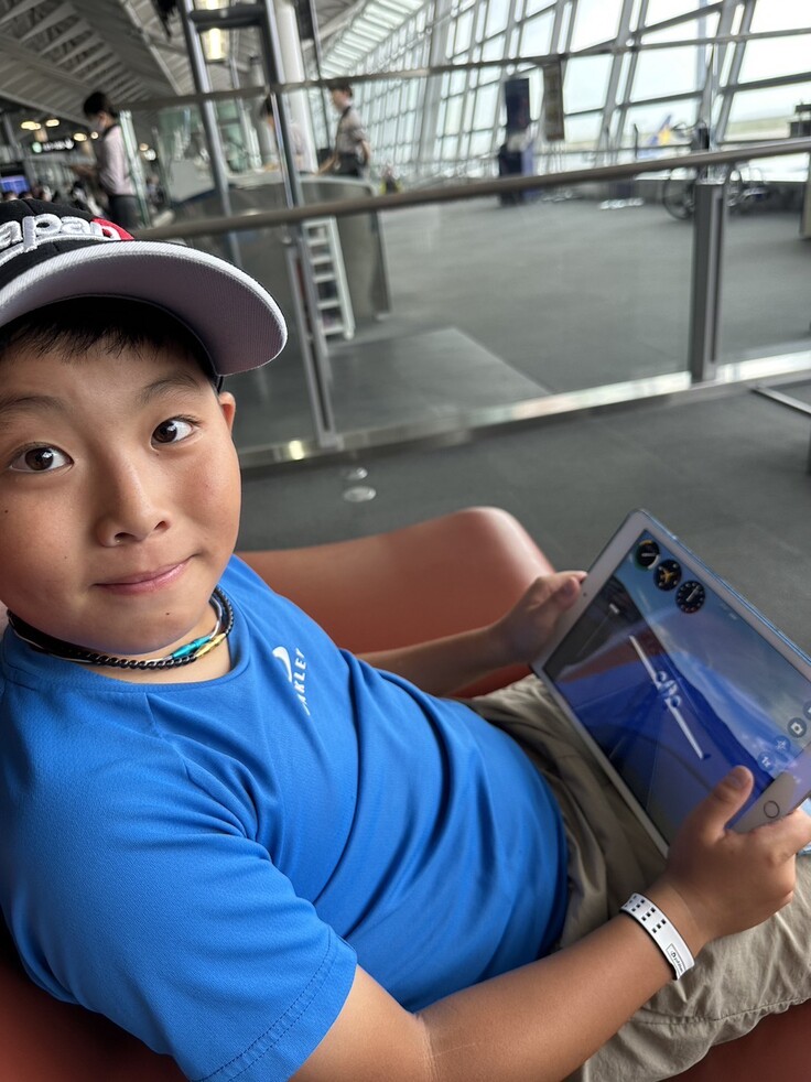 待ち時間には、ゴルフの次に好きと言っていいくらいの飛行機のゲームを楽しんだようです。