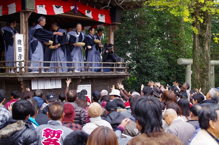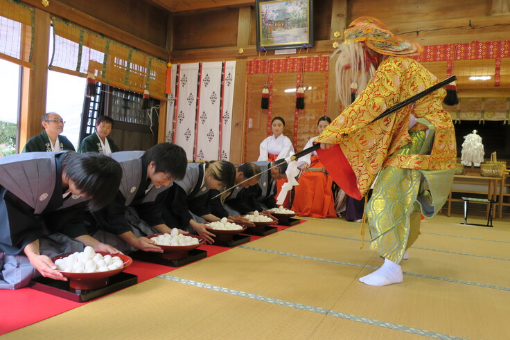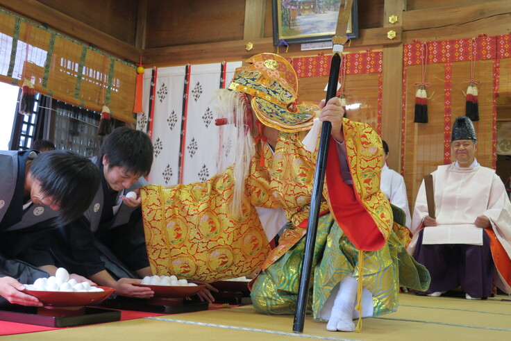 鷲宮神社へ御参りをする時、特に御祈願をする時には鶏肉や卵を断たなければならないという故事に因んだ儀式です。天狗は、山盛りにした卵を「一つ残らず食べ尽くせ」と頂戴人たちを責めます。しかし、頂戴人たちはいくら責められても卵を口にしません。「ありがたきこの卵は、鷲宮神社の習わしに従い、神様にお供えいたします」と言って辞退。その心がけに満足した天狗は、氏子崇敬者の息災を願い、神様のもとへ帰って行くというあらすじです。天狗と頂戴人のやり取りが何とも言えず笑いを誘いますが、周りの見物人たちも賑やかしてくるのでさらに笑いが起こり、見ていてほっこりします。