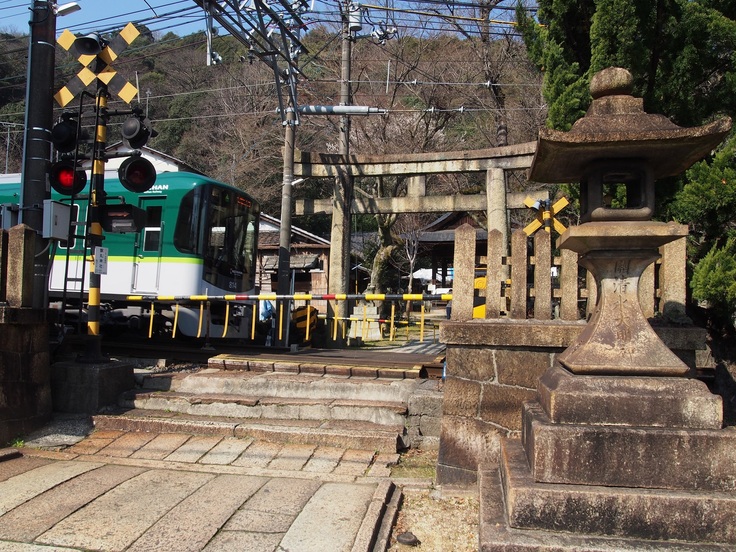 鳥居の手前に踏切があり、京阪電車が参道を横切る風景を間近で見られるのです。最寄り駅の上栄町駅から隣のびわ湖浜大津駅までは路面電車になっており、鉄道写真の愛好家にも人気のスポットです。