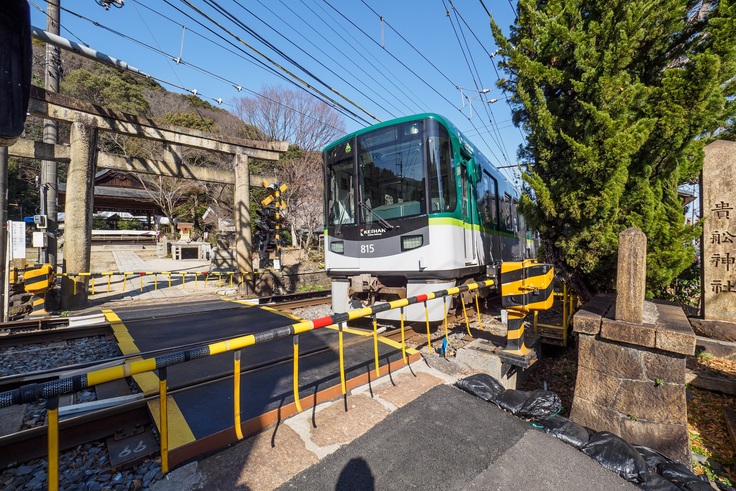 このプロジェクトページでもご紹介いただいているとおり、関蝉丸神社下社の鳥居と、京阪電車京津線の踏切、通過する電車が織りなす、ちょっと変わった光景は、神社さまとのご縁を感じずにいられません。