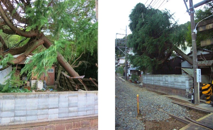 台風被害当時(2013年):関蝉丸神社下社境内入口京阪電車線路の様子