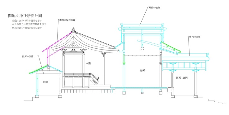 既存の唐門・本殿・廻廊正面の屋根は檜皮葺(ひわだぶき)です。檜皮葺は意匠性が高いですが、非常に高価で、耐久性が環境に大きく左右されます。そこで今回の修理では、社殿の荘厳さを維持しつつ、檜皮葺よりコストが抑えられ、耐久性に優れた銅板葺に替える計画です。