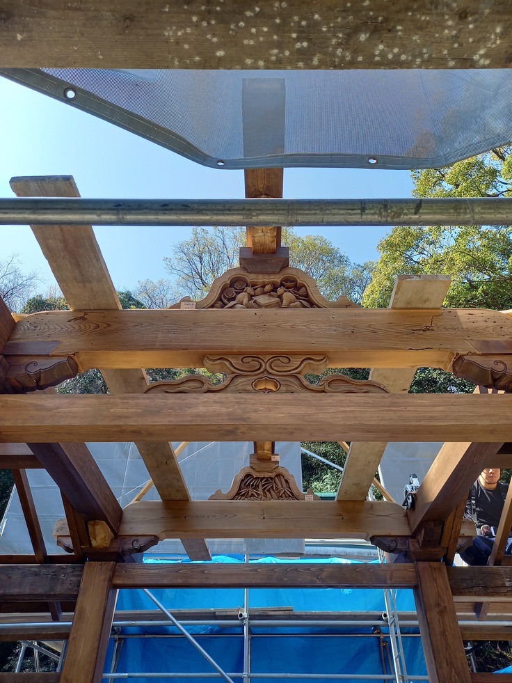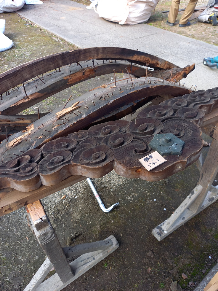 回廊屋根の傷みがひどかった部分を取り外し枠だけになった状態。