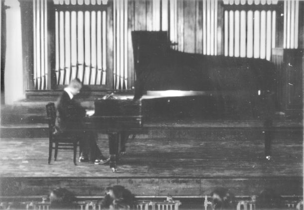 彼の専門はピアノでしたが、作曲にもおおいに興味を持っていたようで、自身で作品を書いては、橋本國彦など作曲の先生の指導を仰いでいたようです。本業のピアノもなかなかの腕前で、昭和17年11月、第142回報国団演奏会では、師の豊増先生の伴奏で、フランクの《交響的変奏曲》を演奏しました。「報国団」は戦時下にあって、国に忠誠を尽くして奉仕することを旨として、さまざまな職場や学校内に組織され、東京音楽学校も例外ではなかったわけです。