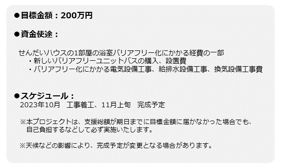 せんだいハウスのベッドルーム浴室(お風呂、トイレ)を改修し、バリアフリー化する。ご支援いただいた資金は、1部屋分の改修費用に充てさせていただきます。