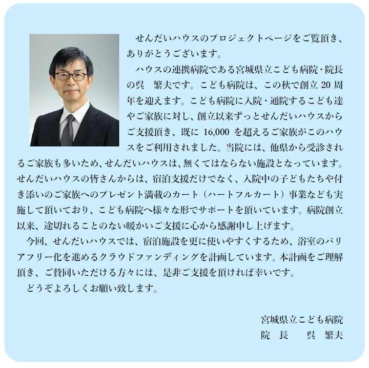たくさんのプロジェクトの中から、ドナルド・マクドナルド・ハウス せんだい(せんだいハウス)のプロジェクトに関心を寄せていただきありがとうございます。