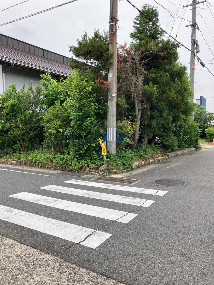 交差点角・個人宅の樹木により道路の見通しが悪くなっていたので、個人宅のご協力を得て宮町役員で樹木剪定をさせていただきました。(202 4.6月)