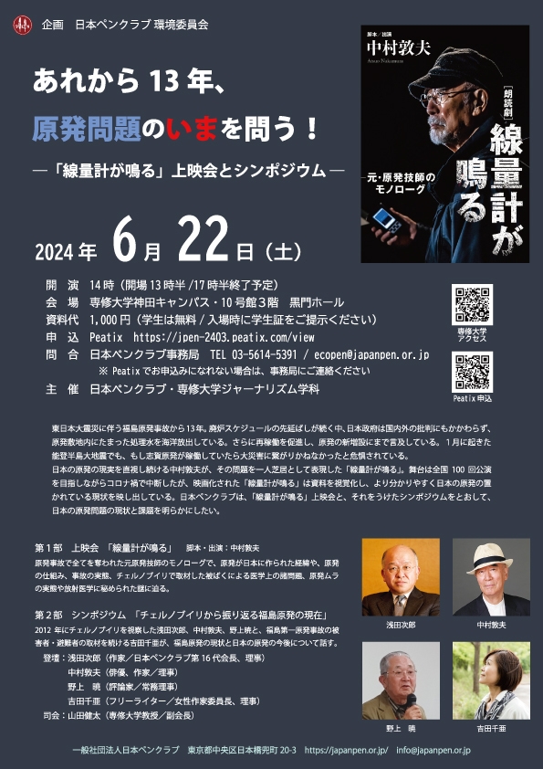 「あれから13年、原発問題のいまを問う!」というタイトルのイベントが開催されます。中村敦夫さんご本人も「線量計が鳴る」の上映会後に、シンポジウムに出演します。お時間のある方はぜひご参加ください。