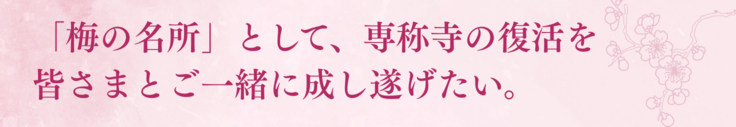 専称寺の歴史、文化や場所の魅力等を知っていただき、応援してくださる方々と共に、専称寺を次世代に継承していきたい。その第一歩として、今回は「梅の名所」としての専称寺の復活を一緒に作ってくださる仲間を募り、皆さまとともに次世代に継承していくきっかけづくりをしたいと考えます。