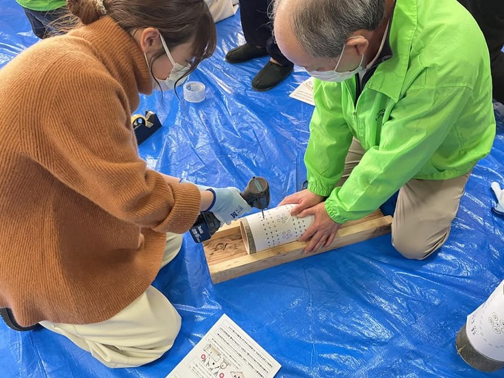 イベントの一つとして、NPO法人いわき竹プロジェクトの皆さまのご協力の元、竹の伐採を行い、その竹を活用して梅のライトアップに花を添える竹灯籠の製作を行いました。