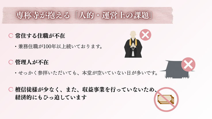 また、時代の変化とともにお檀家さんも減少し、お檀家さんたちと一緒に維持をしていくには限界が生じつつあります。そのため、寺院の運営・経営もとても苦しい状況で、各所修繕・改修も思うように進められていないのが現状です。