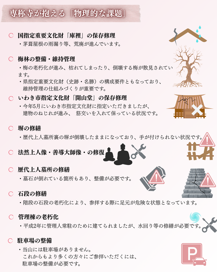 専称寺の600年以上の歴史の中で、国指定重要文化財(建造物)に指定された本堂等、東日本大震災の影響を受けるなどして荒廃した箇所の修復を幾度と繰り返してきましたが、現在様々な箇所に限界がきており、さらなる修繕・改修の必要性に迫られております。