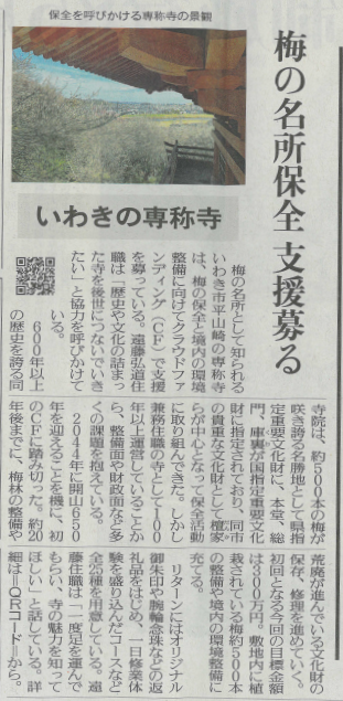 【福島民友新聞社掲載】歴史や文化を後世に…梅の名所保全へ支援募る いわき・専称寺