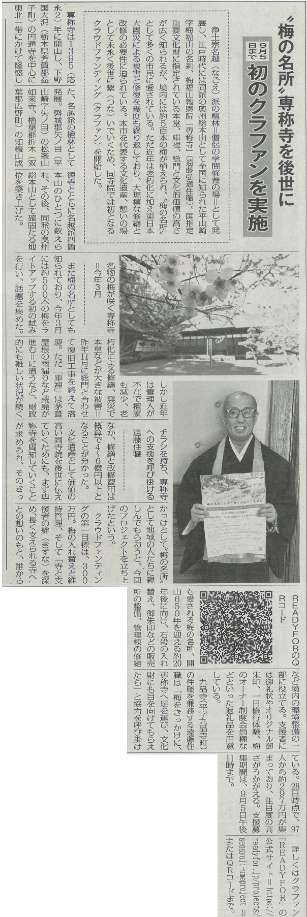 本日は、地元紙・いわき民報社に、専称寺クラファンについての記事が掲載されました。