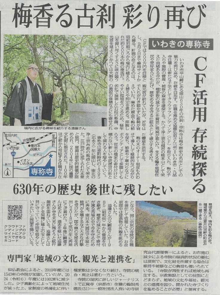 【福島民報社掲載】梅香る古刹彩り再び CF活用存続探る 630年の歴史、国重文後世に残したい