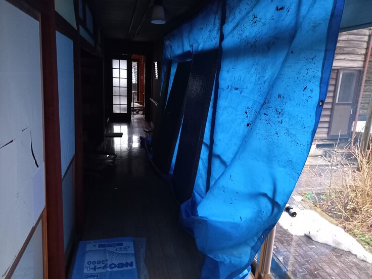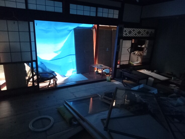 まるで青の洞窟? 庫裏(住居)は、ブルーシートだらけ‼