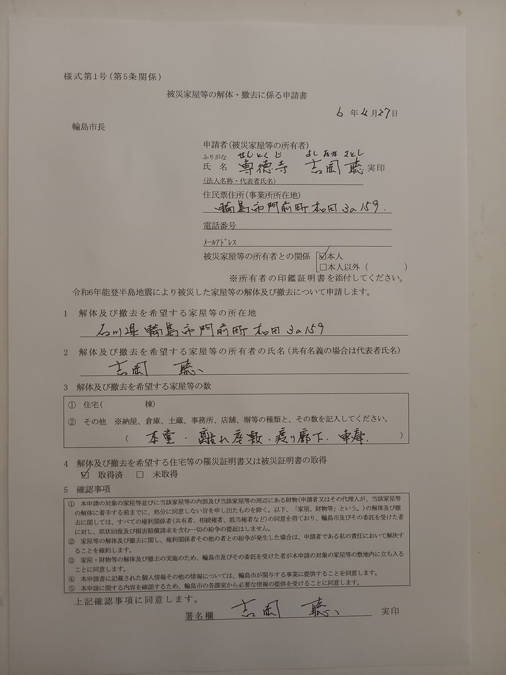 寺は、皆さんの家の解体が終了してから申請を…と思っておりましたが、倒壊した本堂に押され渡り廊下の傾きが進行し、庫裡に倒れ込みそうな為、やむ無く決断しました。こんな日が来るとは…後は、押印して提出‼️ なんとも言えない気持ちです。