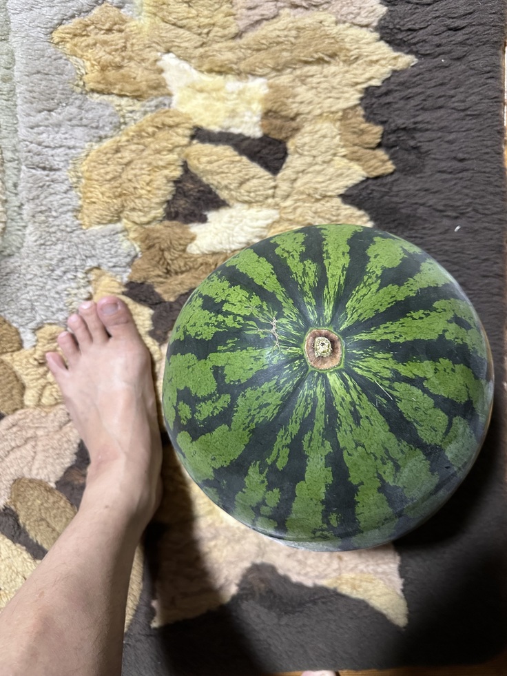 私の足は27.5cmありますが、それと比較してこのスイカがいかに大きいか、分かって頂けるでしょうか?