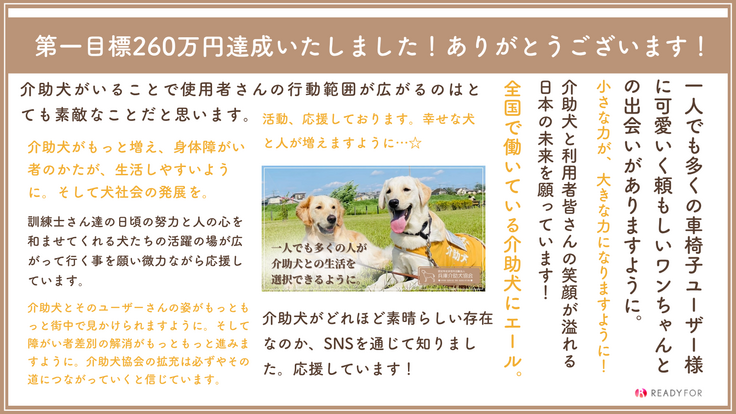 第一目標の260万円に到達することができました!誠にありがとうございます。
