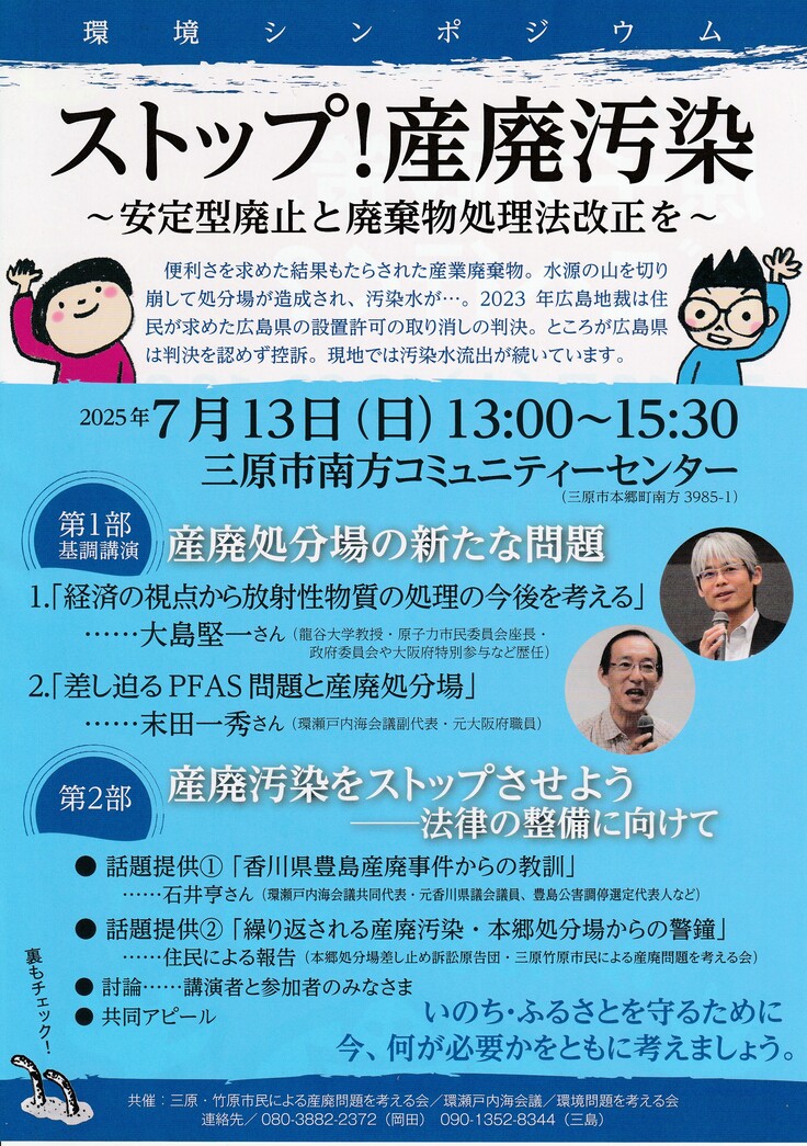 今年は広島県三原市で「産廃処分場と環境汚染」をテーマに,総会&環境シンポを開催します。
