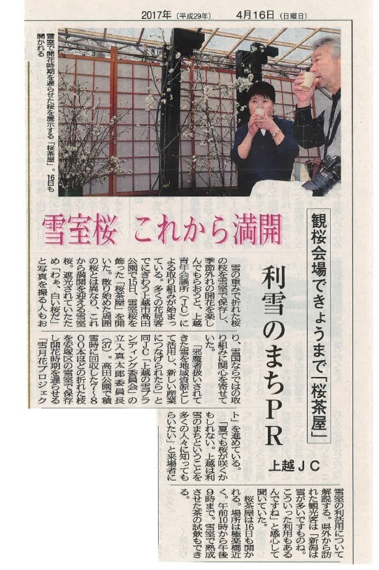4月15・16日が好天に恵まれたお陰で市内を含め市外や県外、そして外国から多数の観光客が足を運んだことで私たちの「桜茶屋」に大勢の来場者がお越しになりました。雪の新しい利活用方法や折れた桜を使って咲かした事など来場者に説明をすると多数の方からご理解と共感を得ることができました。15日の初日に地元新聞から取材を受け翌日の16日の新聞に掲載されましたが、その記事を見て来たという方もいました。
