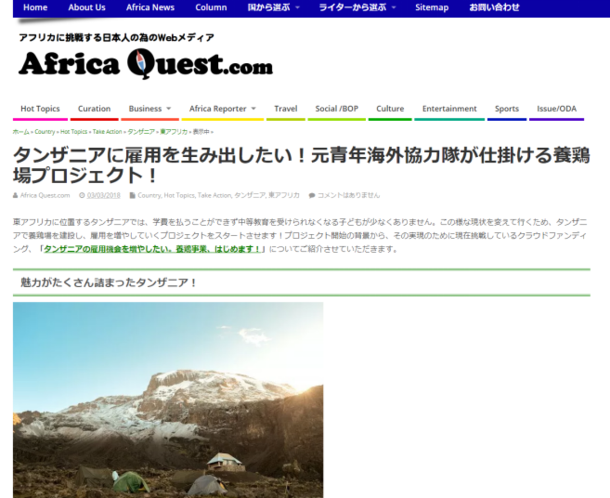 この度、アフリカ専門ニュースメディア「Africa Quest.com」さんに今回のプロジェクトを紹介して頂きました!ありがとうございます!