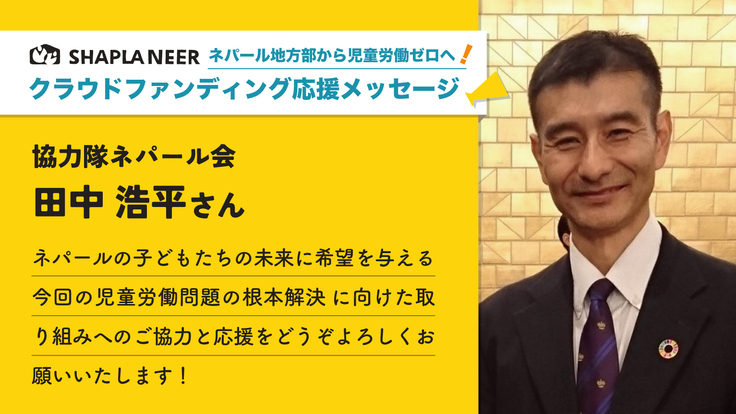 今回は、シャプラニール副代表理事、協力隊ネパール会 田中浩平さんからいただいたクラウドファンディングへの応援メッセージを紹介いたします!