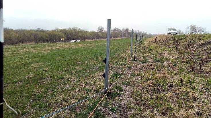 縦50m×長さ500mの放牧地の電気柵の計5段張りが終わりました。