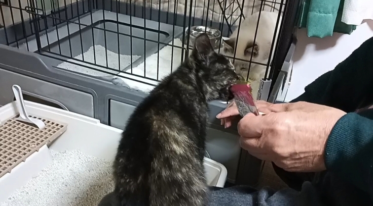 子シャムちゃんはすっかり父に懐いているそうで素手で抱っこもできるそう…