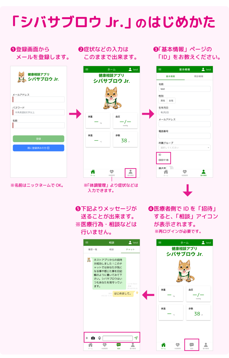 ダウンロードしたアプリの「基本情報」ページの中のあなたのIDを、このHPの応援メッセージ欄やツイッターのDMから教えて頂ければ、医療スタッフより「招待」をして、「相談」の中で体験的にチャットでつながる事ができます*。