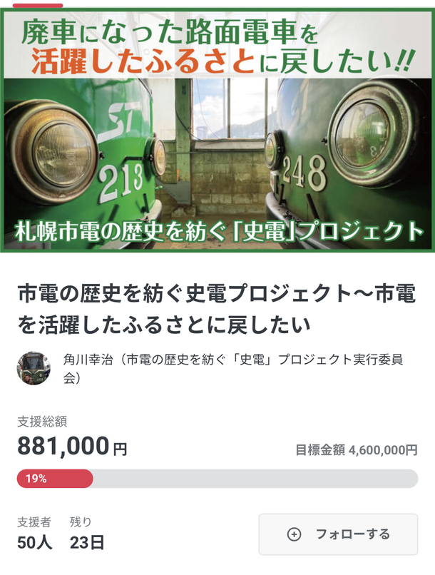残り23日で、あと3,720,000円のご支援が必要です。これが達成できないと、全てがゼロになってしまい、市電を幌北電車庫に置けなくなってしまいます。