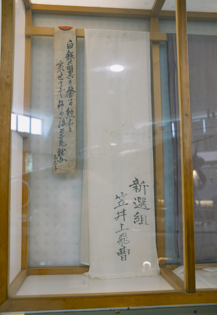 紫電改展示館では、元搭乗員の笠井智一様からご寄贈いただいた『紫のマフラー』を展示しています。