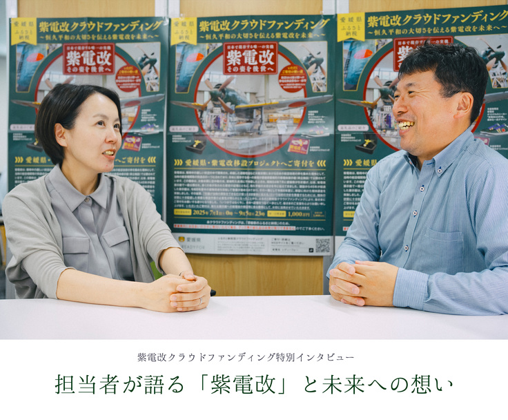 今回、クラウドファンディングの取組みを主に担った都市整備課の主幹浜田(写真右)と係長日野(写真左)の二人に、紫電改の意義やこれまでの歩み、そして未来への展望について話を聞きました。