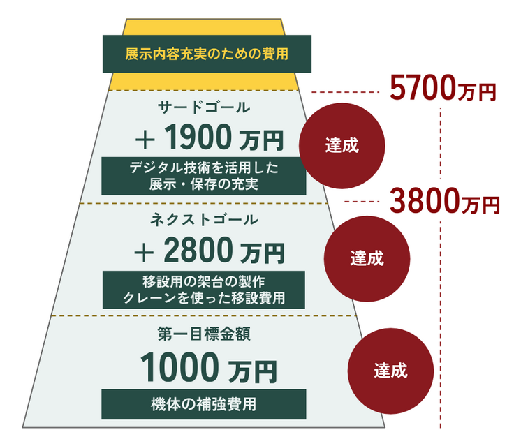 クラウドファンディングは9月5日(金)23時まで続きます。以降、サードゴールの目標金額5,700万円を超えていただいたご寄付は、新設される紫電改展示館において、来館者がより深く学びを得られる環境づくりなど展示内容の充実にかかる費用として大切に活用させていただきます。