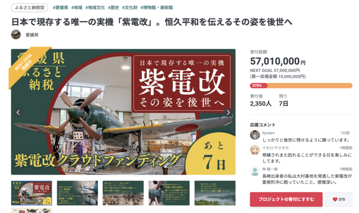 日本に唯一残る実機・紫電改の移設に向けた本プロジェクトは、皆様からのご支援により、8月29日(金)にサードゴールの目標金額5,700万円を達成いたしました。2300人を超えるご支援者様からの温かいご支援と、応援のお言葉に心より感謝申し上げます。