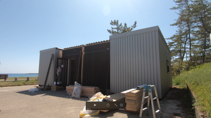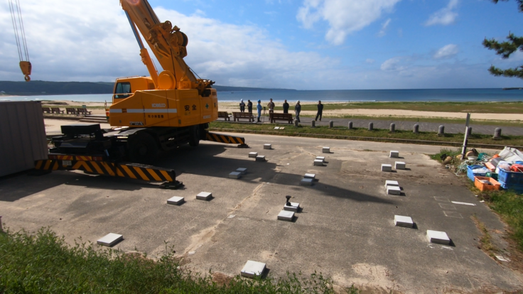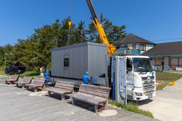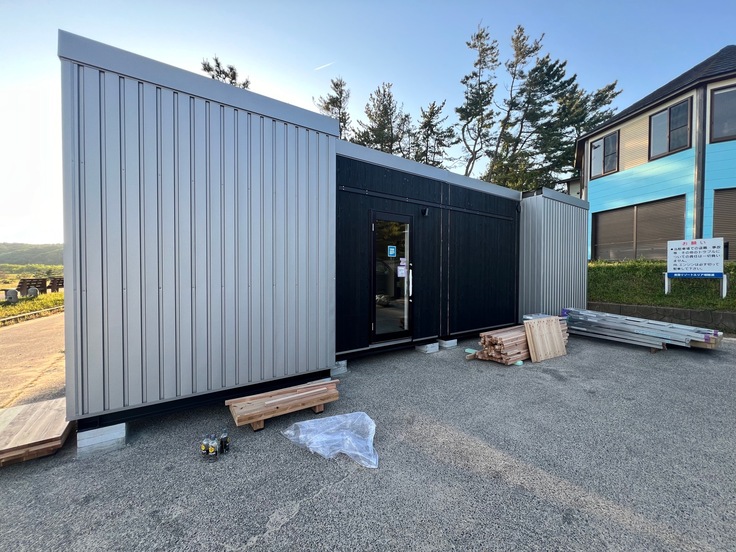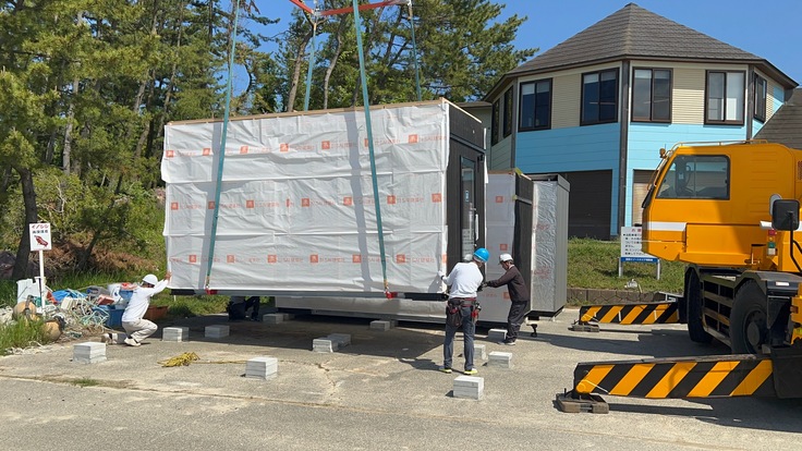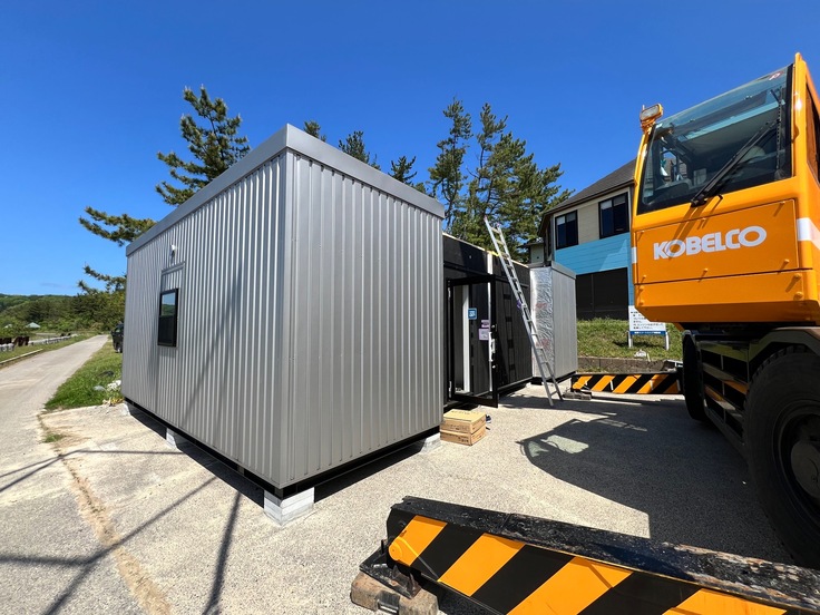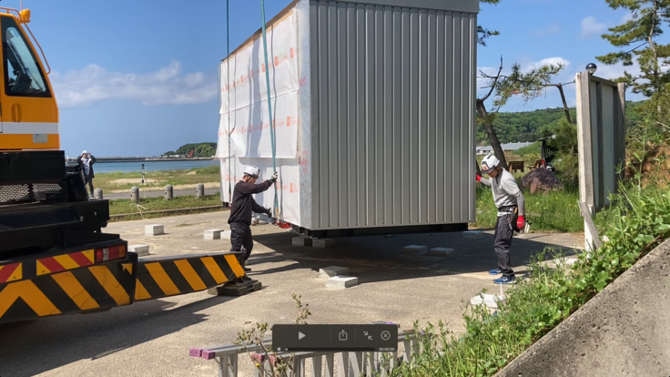 仮説宿泊所のユニットや資材、工事スタッフが、能登半島志賀町のに能登リゾートエリア増穂浦に揃い、現地での設置工事を行いました。