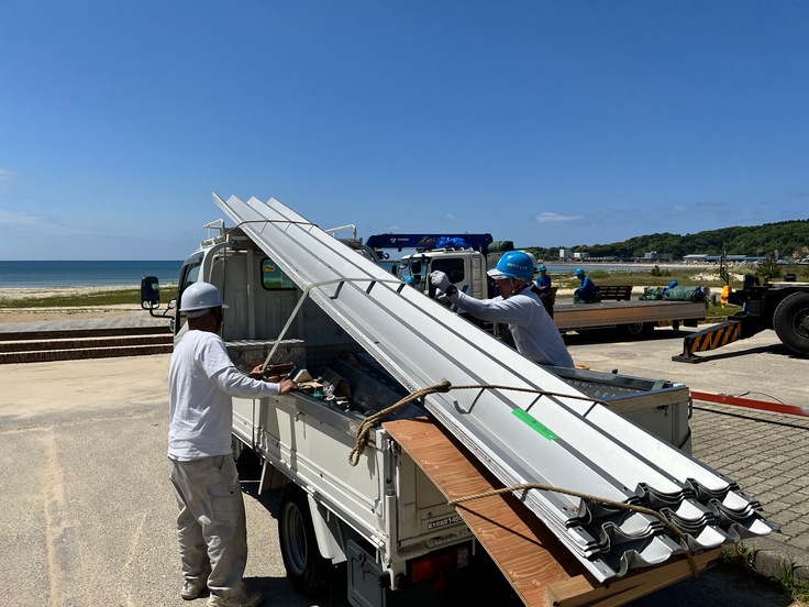 設置工事1日目は天気にも恵まれ、予定通り外壁部分や屋根の工事も順調に進みました。