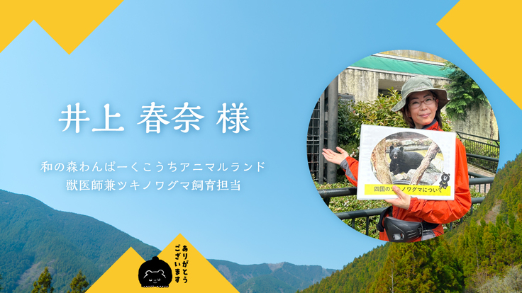 高知市にある和の森わんぱーくこうちアニマルランドで、獣医師兼飼育員としてツキノワグマを10年以上担当しています。先代のおだやかなオス(愛称ワカ、和歌山県出身)や現在飼育中のおてんばなメス(愛称キノ、山口県出身)の飼育を通して、賢く、食いしんぼうで、感情豊かなツキノワグマの魅力を感じています。