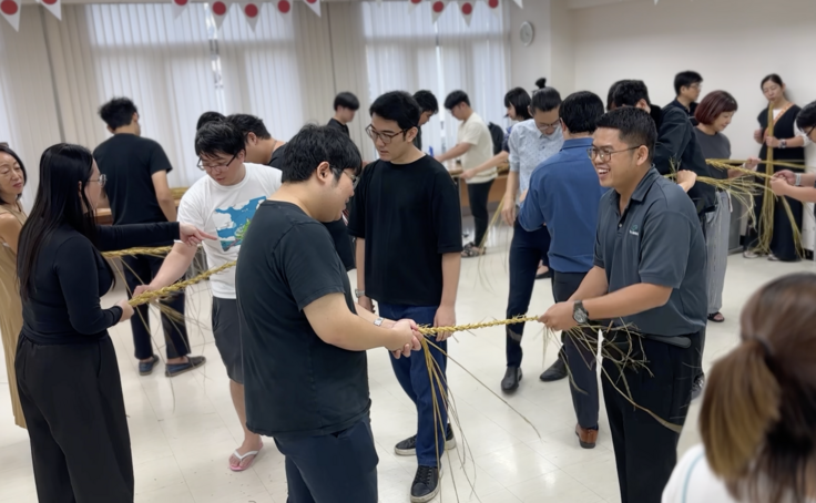 そして、実際のしめ縄づくりですが、チュラロンコン大学の時もそうでしたが、みなさん、とてもお上手で、今回、逆向きに締めるような方がいらっしゃらなかったので、仕上げの部分で少し助成するくらいでいけました。