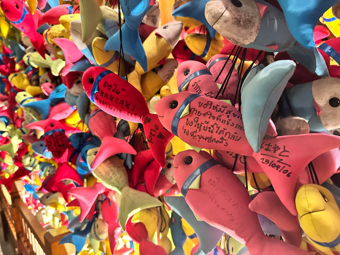 社殿の側面には魚を模したぬいぐるみが数多く飾られている。