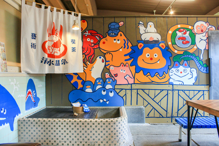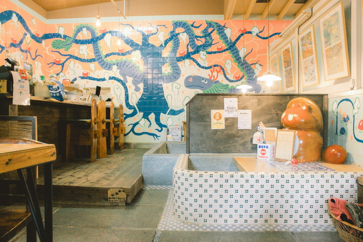 また、古き良き町の銭湯の姿を復活させた店内は、アートカフェという名の通り、壁画をはじめとする画家ヒダカナオトのアートワークに溢れた空間となっています。