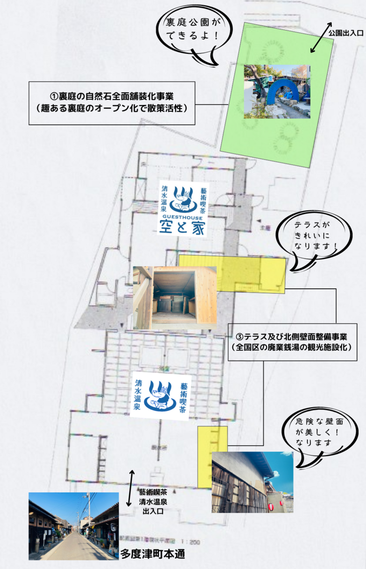 香川県多度津町本通にある「藝術喫茶清水温泉」と「おのみち屋」の運営会社である合同会社ふくぞうは、2,3年後の重伝建=文化庁:重要伝統的建造物群保存地区の選定を目指している多度津町の状況を踏まえ、100年の歴史ある町の元銭湯「藝術喫茶清水温泉」の魅力日本一複合型観光施設化をはじめ、多度津歴史通りの加速度的な地域活性化を図る覚悟のまちおこしプロジェクトを行います。具体的には、ゲストハウスに隣接する趣ある 眺望の藝術喫茶清水温泉2Fテラス の改修事業に加え、建屋北側にある桃陵公園に通じる小径沿い壁面の補修工事を行います。また、通り中心部に遺されている「尾道屋」の保全事業にも着手します。本プロジェクトで多度津歴史通りの魅力をさらに引き出し、地域に遺された地域資源(古民家)の新しい活用実践に積極的に取り組んで参ります。尚、皆様からのご支援はすべて古民家保全活用工費に充てさせて頂き、地域資源(=古民家)を人々が大切にしたい、守りたいと思える活用成果(地域活性化)を生み出したいと思います。施設内覧会や複合施設化完成セレモニーも予定しております。どうぞ、宜しくお願い申し上げます。
