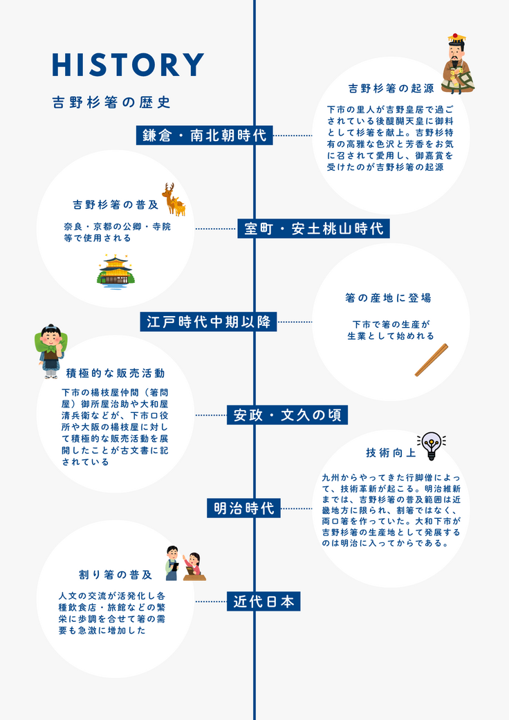 明治末期に京都の箸商人からこの下市町に移住した小間治三郎は、利休型割箸を考案し、割箸業界に新しい息吹を与えた。大正五年やはり下市町で天削型割箸が開発され、吉野杉の割箸生産は、飛躍的に伸びた。専従人員は二千五百人を超えて、太平洋戦争までは全国の割箸の九十%強が下市町で造られた。