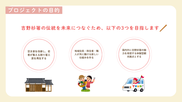 本プロジェクトでは、吉野杉箸の伝統を未来につなぐため、以下の3つを目指します。