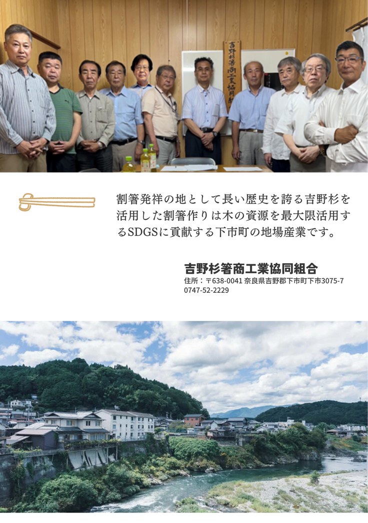 奈良県吉野郡下市町で大正9年に同業者組合として設立され、創設百五年を迎えました。特産品の吉野杉箸は生産者がどんどん減っています。後醍醐天皇に御嘉賞を受けたと記録が残る吉野杉箸を未来に残すため努力します。