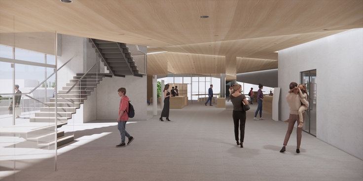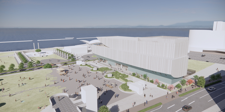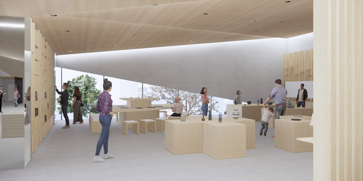 新しい琵琶湖文化館が2027年に開館します。フネノキミチやインフォメーション・ラーニングセンターは、地元の人々や観光客が気軽に立ち寄り、学びや交流が自然と生まれるような、開かれた場となることを目指してデザインしました。琵琶湖の風景をモチーフにしたグラデーションの色彩の軒天や、県産材の温かみを感じられる内部空間がよりいっそう場をひきたてています。素晴らしい博物館となるよう、皆さまのお力添えをいただければ幸いです。