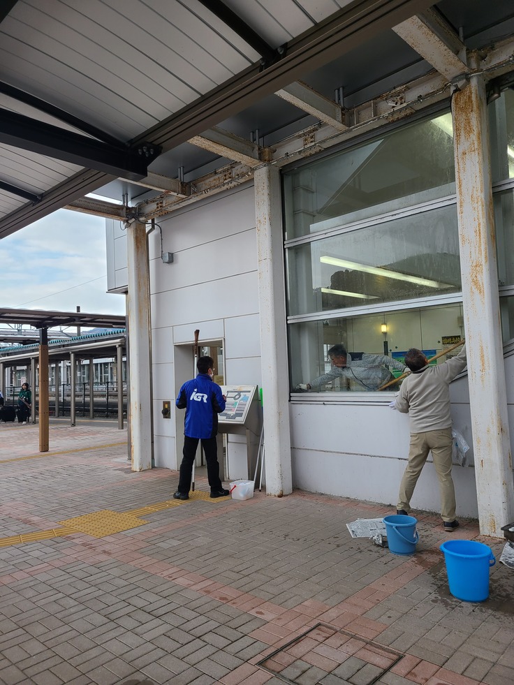 だいぶ、二戸駅の駅舎の窓ガラスも汚れていたので、共同で清掃しました。